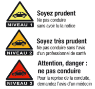- Niveau 1 : le risque est faible et dépend largement de la susceptibilité individuelle. La prise du médicament ne remet généralement pas en cause la conduite de véhicules mais nécessite de faire attention aux effets indésirables.